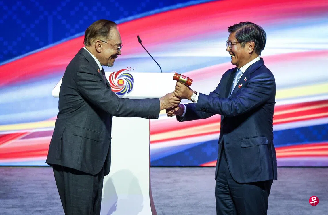 在亚细安峰会闭幕仪式上,马来西亚与菲律宾交接轮值主席国职务。从马来西亚首相安华的手中,菲律宾总统小马可斯(右)接过象征亚细安轮值主席国职务的锤子。
