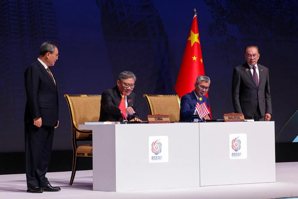 东帝汶正式加入亚细安大家庭,马来西亚首相安华(左五)在宣言签字仪式上向东帝汶总理古斯芒(左四)表示祝贺。同框的有新加坡总理黄循财(左起)、泰国首相阿努廷、越南总理范明政、菲律宾总统小马可斯和文莱苏丹波基亚。(马新社)