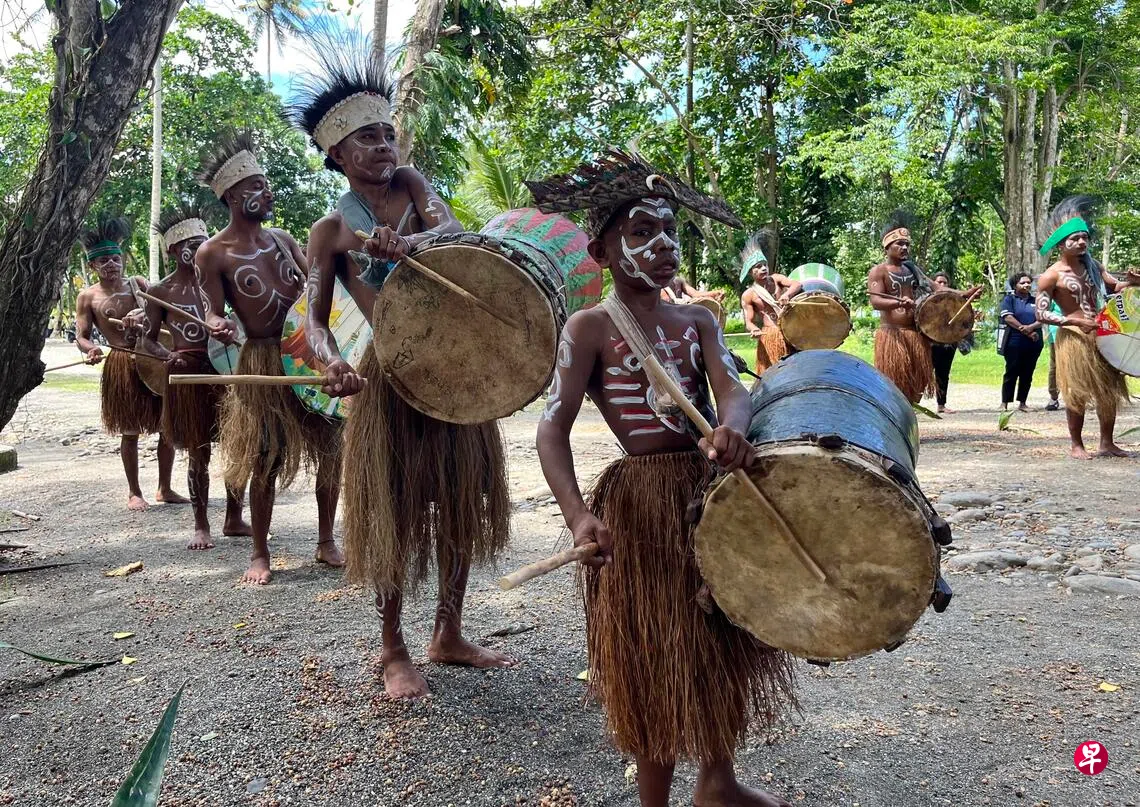 12月2日,在印度尼西亚西南巴布亚省坦布劳县(Tambrauw),当地村民打鼓欢迎到访的宾客。