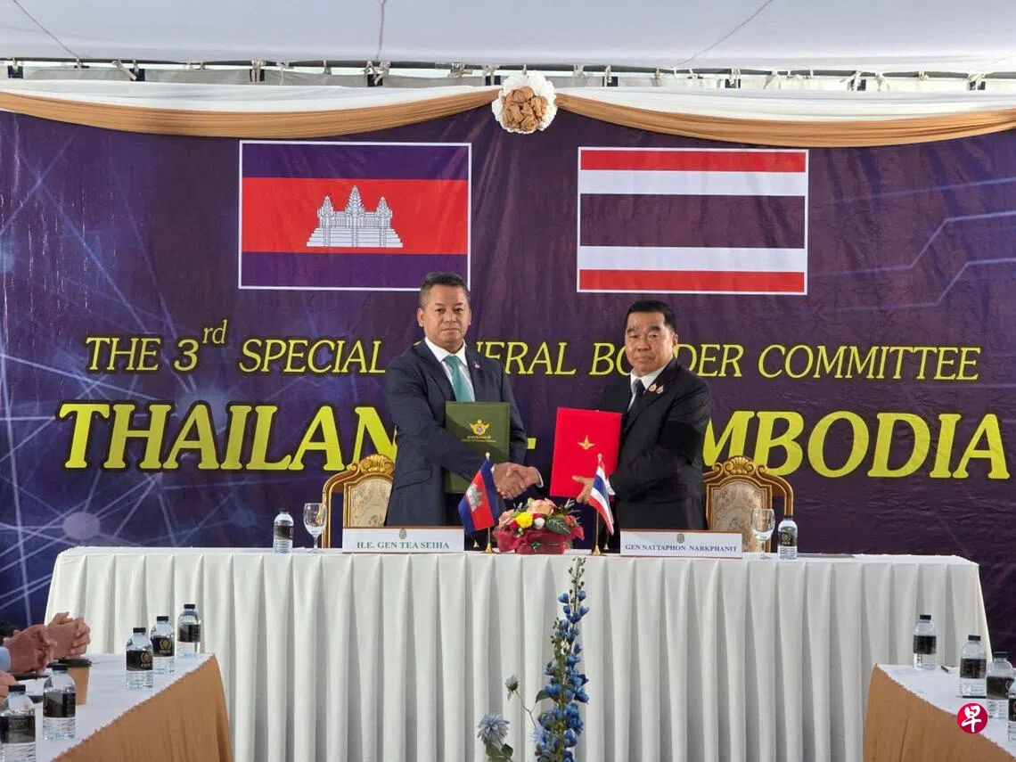泰国和柬埔寨国防部长星期六(12月27日)上午在泰国东部边区尖竹汶府的班帕加边境检查站会面。两人过后签署联合声明,宣布从当地时间当天中午12时(新加坡下午1时)起停火。