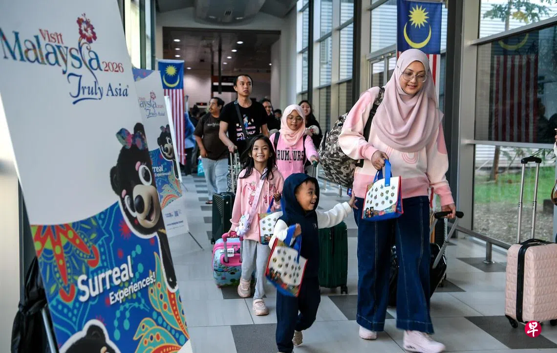 马国政府定下2026旅游年吸引4700万游客人次的目标,并创造3290亿令吉(约1041亿新元)的旅游收入。图为吉打苏丹阿都哈林机场周四迎来今年首批游客。吉打州政府希望借助旅游年活动,在今年吸引约700万游客人次到吉打游玩。(马新社)