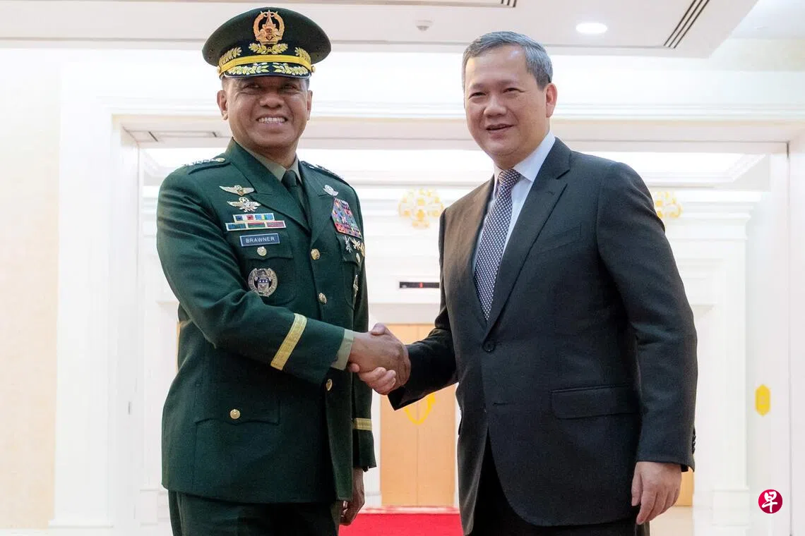 《柬中时报》报道,柬埔寨首相洪马内星期四(12日)在金边接见到访的菲律宾武装部队总参谋长布劳纳时,高度评价亚细安观察团在当前局势中的作用,并相信菲律宾担任亚细安轮值主席国期间,观察团将发挥更积极和富有成效的协调作用,协助柬泰双方和平解决分歧。