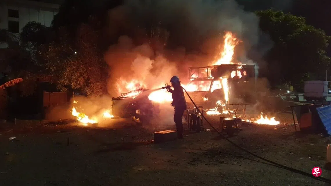 柔佛新山甘榜拿督苏莱曼一个烟花摊星期一(3月23日)晚间失火,烧毁一辆汽车与一辆餐车,但并未造成人员伤亡。