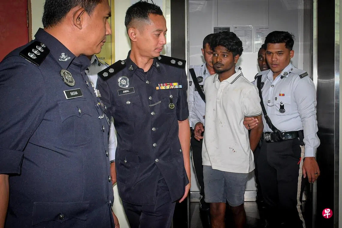 被告沙伽纳峇迪星期三(4月1日)早上被押送到巴生推事庭面控,面对谋杀和吸毒等罪状。