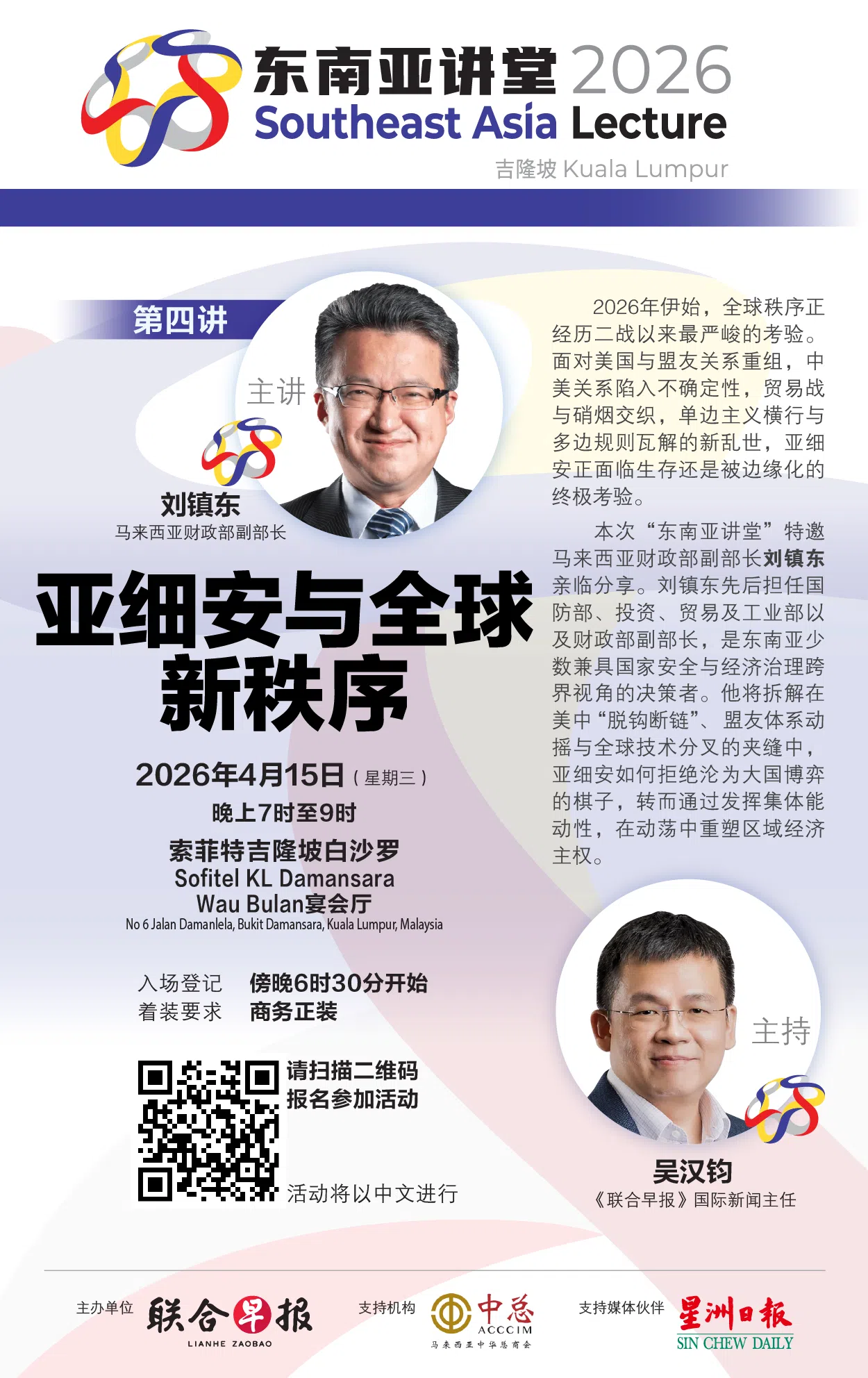 聚焦东南亚区域课题的“东南亚讲堂”,今年移师马来西亚首都吉隆坡,并邀请马来西亚财政部副部长刘镇东,于4月15日在索菲特吉隆坡白沙罗酒店(Sofitel KL Damansara),围绕“亚细安与全球新秩序”开展对话。