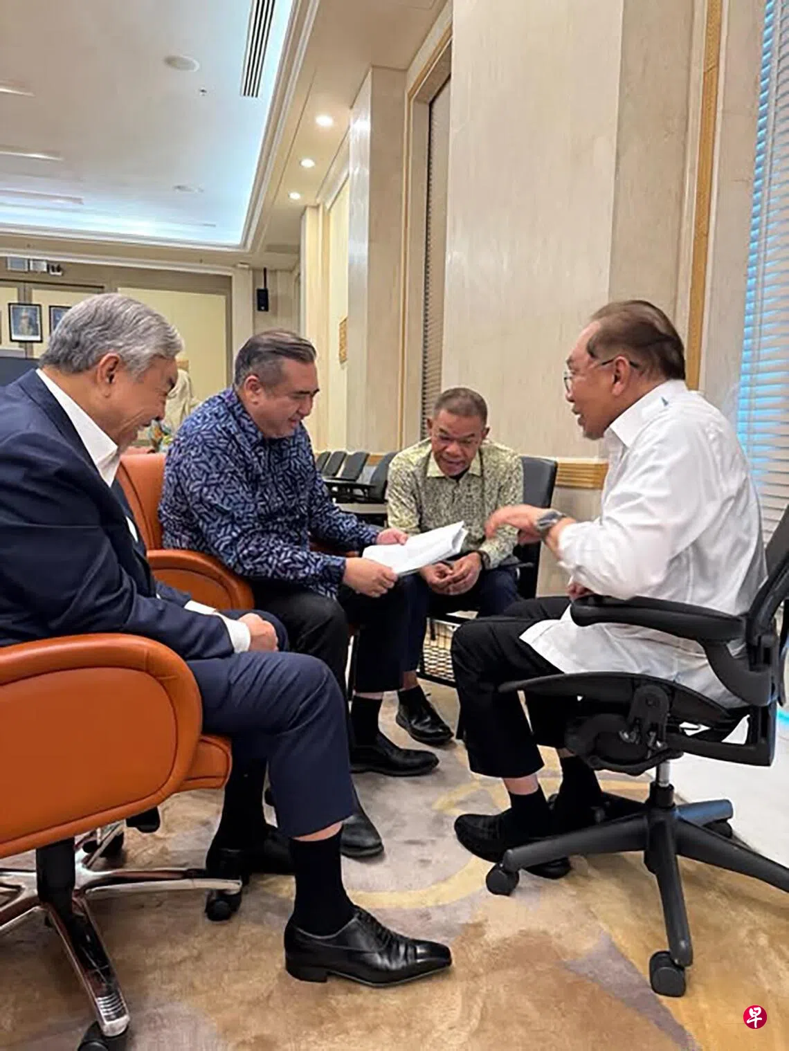 通讯部长法米星期二(4月28日)下午在脸书发布一张首相及希盟主席安华、副首相及巫统主席阿末扎希、交通部长及民主行动党秘书长陆兆福,以及内政部长赛夫丁会面的照片。