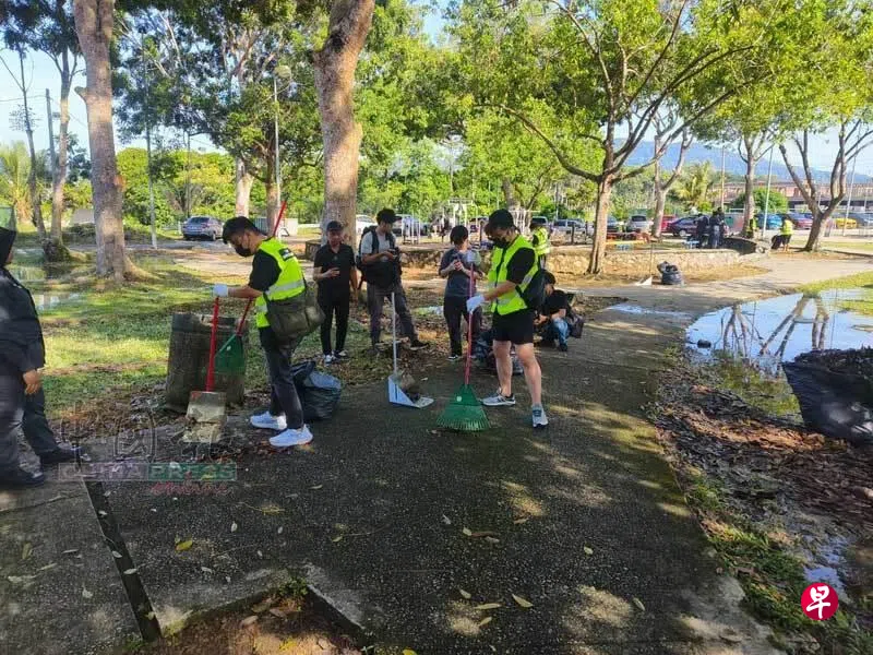 两名新加坡籍男子因今年初在马来西亚的公共场所乱丢烟蒂,受罚到公园扫树叶。