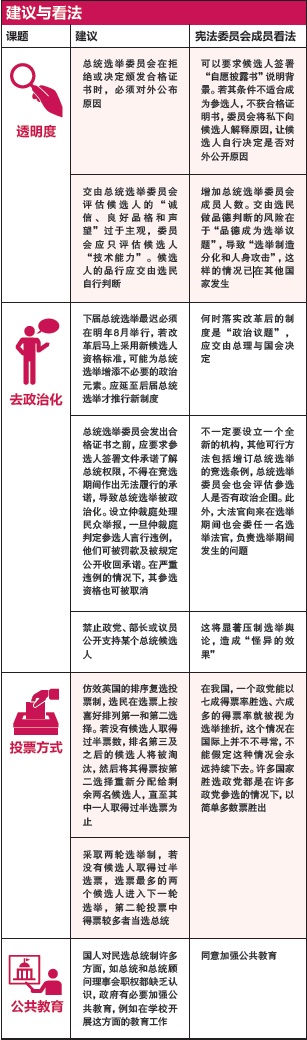 目前,曾担任过国会议长、大法官、部长、常任秘书,或缴足资本达1亿元以上的公司主席或总裁,都有角逐总统的资格。不过,缴足资本达1亿元的私人企业已从1993年的158家剧增至目前的超过2100家,符合担任总统资格的人也相应大增。陈述者提出的建议,主要围绕在如何提高私人领域候选人门槛。