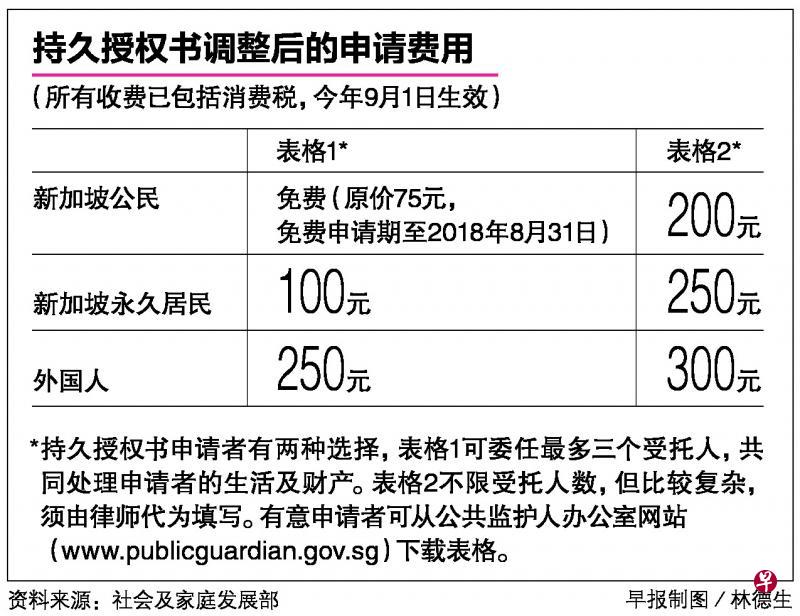 社会及家庭发展部昨早发表文告说,公共监护人办公室在评估营运成本后,将从9月起调整LPA的申请费用。表格1收费从现有的50元手续费上调至75元,但新加坡籍申请者仍不必付费。新一轮免费申请将在2018年8月31日到期。