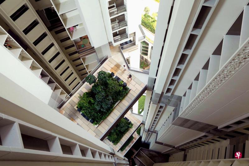 以三座47层楼摩天组屋组成的杜生庄有960个单位,除了多处设立斜坡和无障碍走道,也着重提供社区空间。组屋采用“空中村庄”的概念,分别在3楼、14楼、25楼和36楼共设12个“空中花园”,让每80户人家形成一个村庄,共用一个空气流通良好、绿意盎然的小花园。居民们出入时经过这里能互相问好,也可举办活动,促进邻里间的交流。(萧紫薇摄)