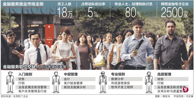 调查发现,去年第四季度,领先的20家金融服务相关企业有意招聘的人数达总职位空缺数量的71%。它们大多属入门、中层及专业级别的职位,包括销售、行销、账目管理、业务发展,数据分析、科技资信安全及品质管理等。