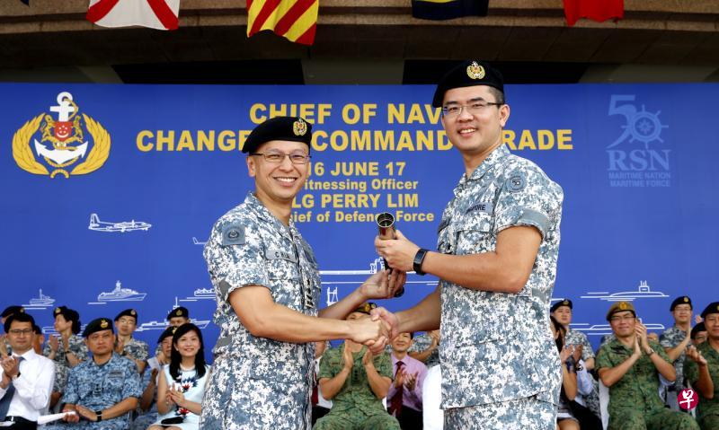 柳俊泓(41岁)昨天上午在新加坡号—樟宜海军基地的交接仪式上,从黎忠汉(44岁)手中接过象征海军领导权的棒子,走马上任。