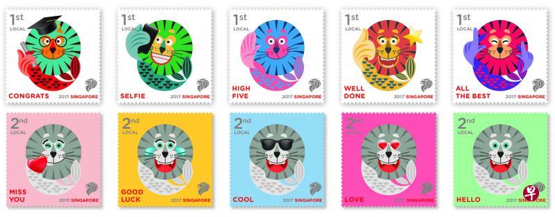新加坡邮政(SingPost)昨日起推出全新邮票系列,用带着表情符号(emoji)传递一般问候和祝词的鱼尾狮,来传达国人熟悉的10种日常表情,包括“恭喜”“好运”“做得好”“哈罗”等。