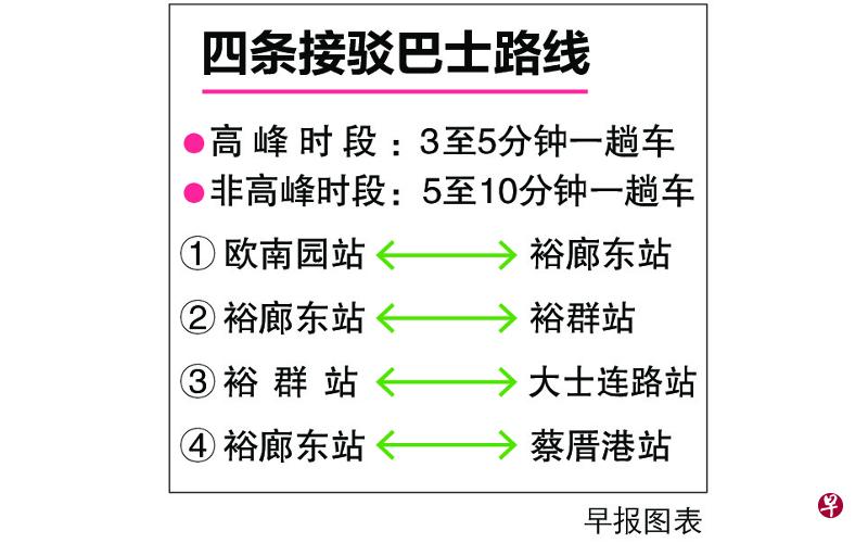 这些接驳巴士只在受影响地铁站停靠,收费与地铁车资相同,高峰时段每3至5分钟会有一趟车,非繁忙时段则是每5至10分钟一趟车。