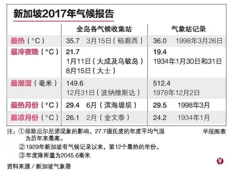 新加坡2017年的年度平均气温达27.7摄氏度,除了受厄尔尼诺现象影响的年份外,这是有记录以来最热的一年,显示我国因为环球气候变暖和城市化等因素,气温长期上升。