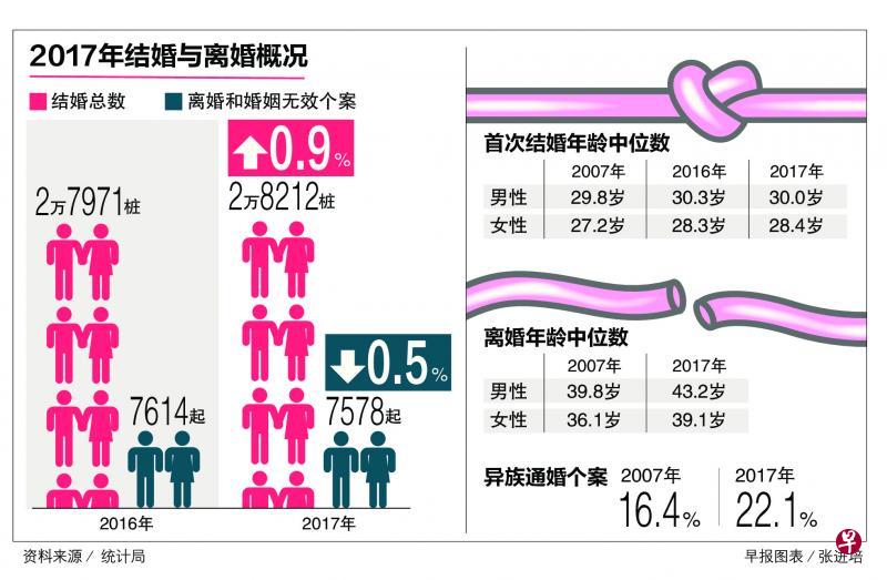 统计局昨天公布2017年结婚与离婚概况数据,去年共有2万8212桩婚事,与前年的2万7971桩婚事相比,略增0.9%。这主要因为去年的民事及回教法注册的婚姻有所增加。