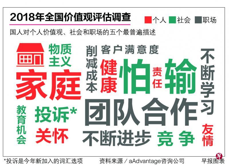 本地私人咨询公司aAdvantage昨天(30日)公布一项针对2000名国人的公开调查,展现国人看待自己、社会和职场的态度。调查要求受访者从100多个描述中选择10个最能够形容我国社会当前状况的词汇,结果“怕输”是最多人挑选的特征,其次则是“投诉”和“竞争”。
