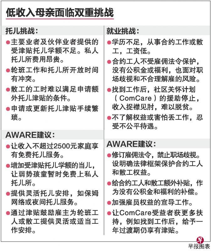 AWARE提出的建议包括让收入不超过2500元的家庭享有免费托儿服务,以及推出受政府监管的灵活托儿服务,如设立有执照的保姆网络,以及鼓励业者提供夜间托儿服务等。
