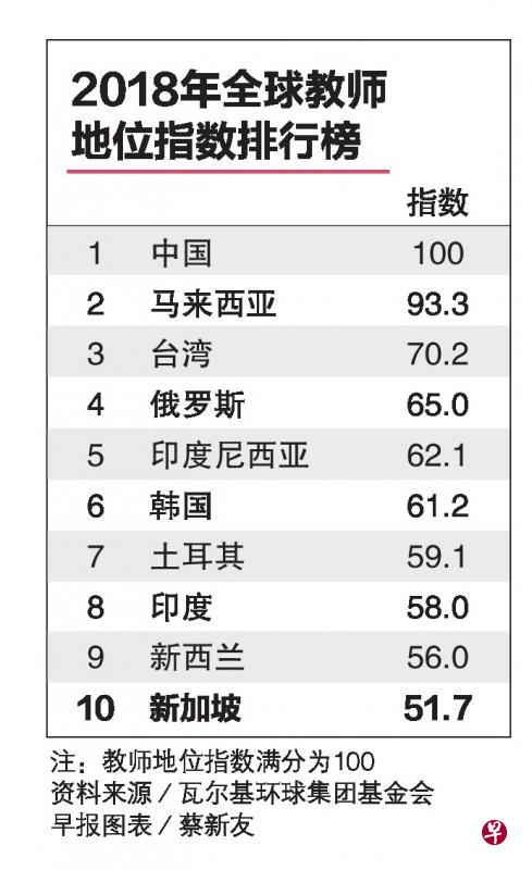 在教师地位方面,新加坡的指数为51.7,比五年前调查的46.3有进步。在本次调查中,新加坡的教师地位在35个国家中排第10;2013年的调查中,新加坡在21国家中排第七。