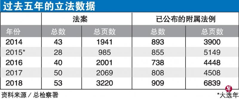 根据总检察署提供的数据,在2014年至2018年之间,除了2015大选年国会解散,法案数量较少,每年提呈给国会审议的法案至少有40项。