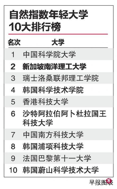 科研论文数据库“自然指数”首次公布“自然指数年轻大学排名”,新加坡南洋理工大学排名第二,也是本地唯一登上这个排行榜10强的本地大学。