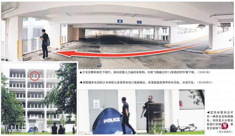 车轮挡靠近停车场边缘,脚踏车撞上后少女被向前抛飞,越过围栏直坠六层楼的高度,不治身亡。