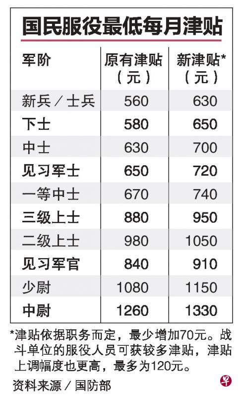 新加坡武装部队、新加坡警察部队和新加坡民防部队的全职服役和战备人员,即日起可享有更高的津贴,视个别职务而定每月津贴增加介于70元至120元。