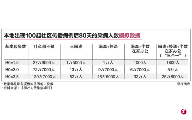 结果显示,以最轻微的传染力度,也就是R0等于1.5来说,在出现100起病例后的80天,如果什么都不做的话,本地将有27万9000人染病;如果只做隔离,人数将减至1万5000人;如果是隔离加停课,人数可减至1万人;如果是隔离加半数在家办公,就只有4000人染病,如果是“三合一”措施,人数可进一步减至1800人。(见表)
