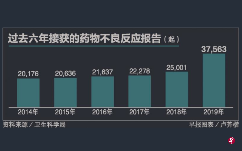 卫生科学局透露,去年共接获3万7563起不良药物反应报告,比起前年的2万5001起激增一半,当中多数由公共医院和综合诊疗所的医生和药剂师通报。其中,引起不良反应的药物绝大部分是西药,其次是疫苗。