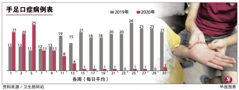 尤其从第13周起至第31周(3月底至7月底),包括病毒阻断措施逐步松绑后的过去两个月,到综合诊疗所求诊的每日平均手足口症病例维持在五起或以下,比去年同期的15至26起少了至少六至八成。