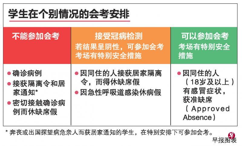 那些因有急性呼吸道感染症状而休病假,以及家里有人获居家隔离令而休缺席假的学生,在接受冠病检测后,若结果呈阴性,也可参加会考。因家中有人出现感冒症状,而获准缺席的学生也准许应考。