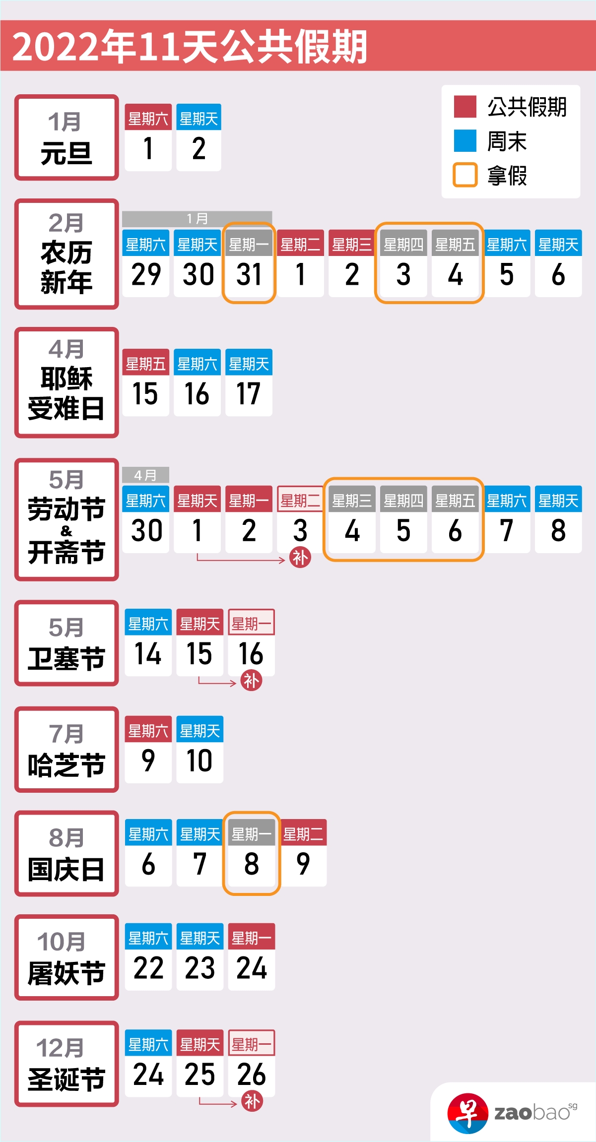 上班族翘首以盼的2022年公共假期出炉啦!人力部今天(4月6日)发布2022年公共假期文告,11天公共假期中,6天落在星期五、星期天或星期一,不用请假就有五个长周末。