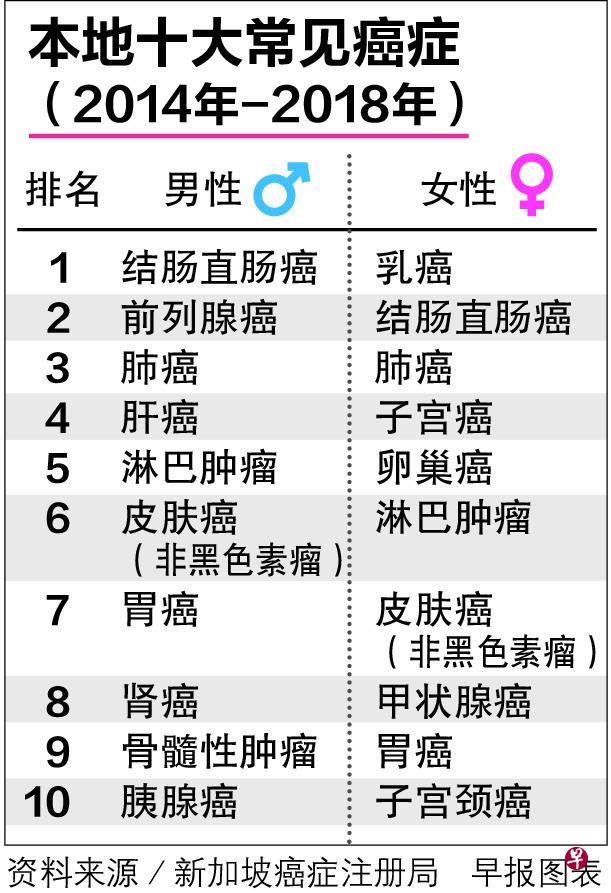 根据新加坡癌症注册局上月底公布的2018年最新数据,从2014年至2018年,本地有3万6187名男性和3万8349名女性被诊断患癌,相当于每天40人确诊。在这五年间,也有1万5429名男性和1万2706名女性死于癌症,相当于每天15起癌症死例。