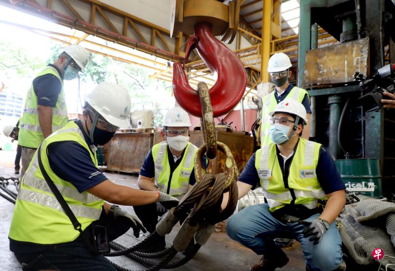 人力部高级政务部长扎吉哈(中)昨天随人力部稽查员突击检查从事废铁回收业务的翊晟国际私人有限公司(Esun International),包括检查现场的吊高设备。
