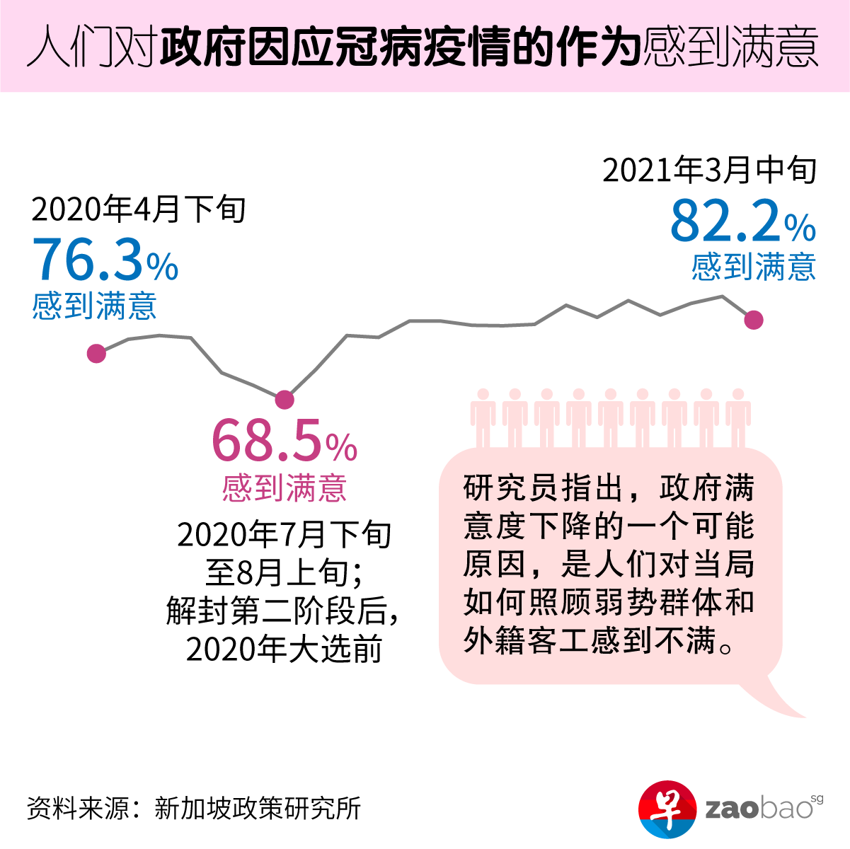 新加坡人对政府处理冠病危机的方式和作为感到大致满意,2020年4月对政府整体表现感到满意的民众达76%,今年3月则达82%。