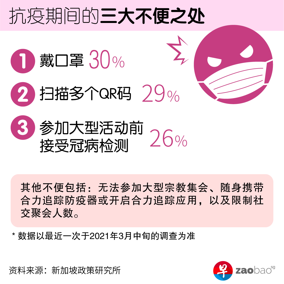 结果显示,随着安全措施逐渐成为国人的生活新常态,认为这些措施对生活造成不便的人正慢慢减少。例如,认为在不同出入口多次扫描SafeEntry QR码很麻烦的受访者,已从2020年6月底至7月初的39%高点,减少至今年3月的29%。