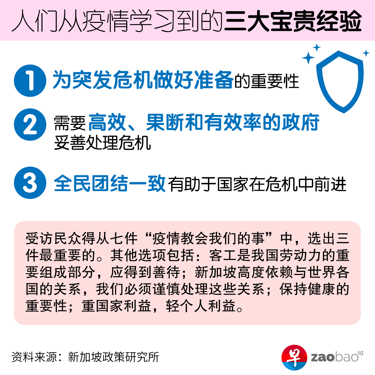 调查过程中,受访民众得从七件“疫情教会我们的事”(Lessons learnt from the Covid-19 Pandemic)中,选出三个最重要的: