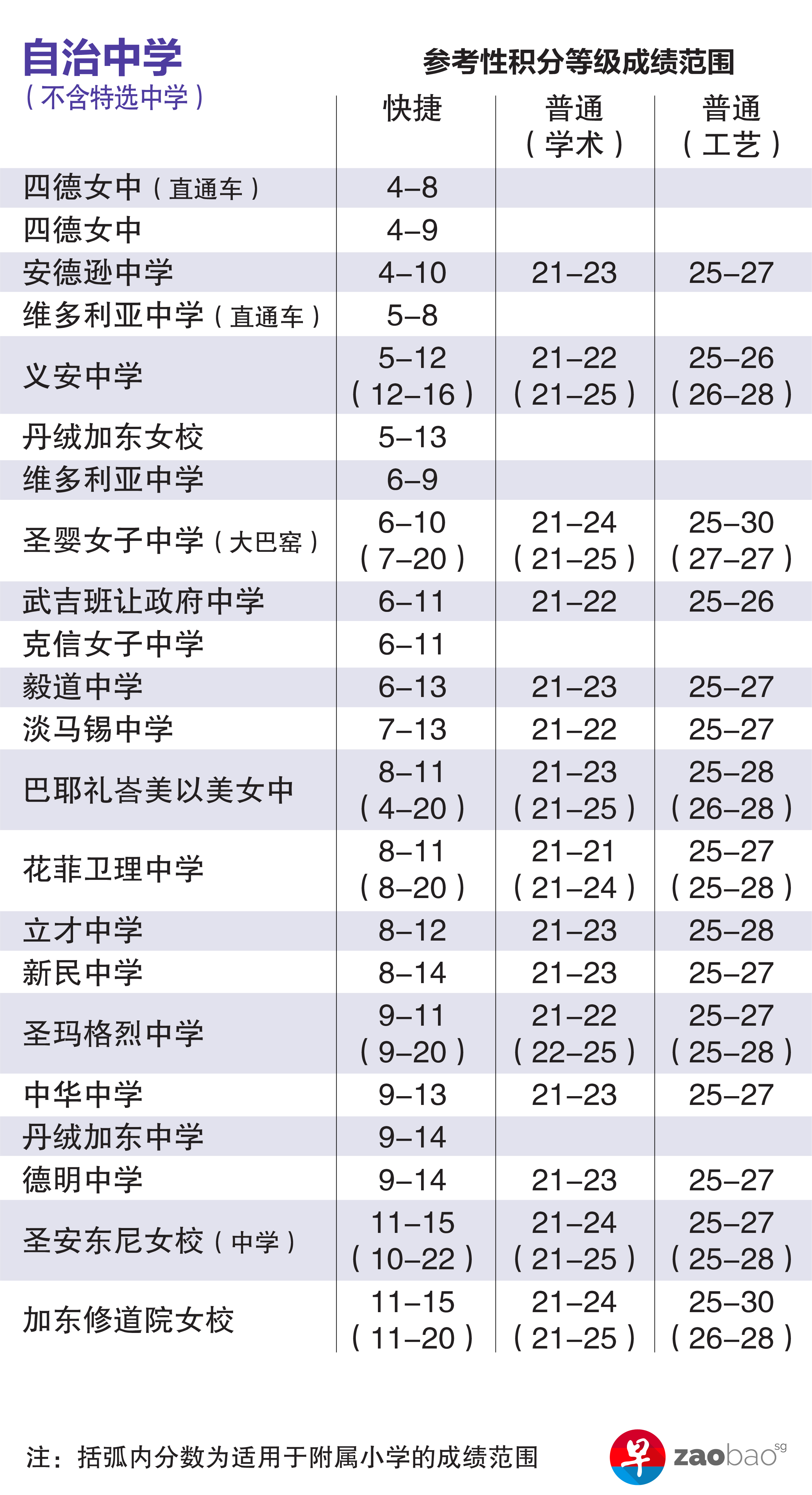 教育部今天(4月27日)公布本地各所中学的参考性积分等级截分点(Indicative Achievement Level Cut-Off Points),以及录取学生的成绩范围,是不是让你看得眼花缭乱?zaobao.sg整理出热门中学的成绩范围,希望对家长和应届考生有所帮助!