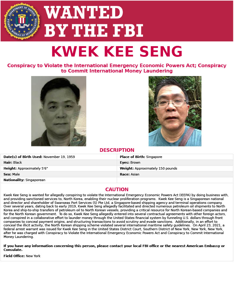 新加坡商人郭启胜(音译,61岁)最近涉嫌违反美国对朝鲜的经济制裁及洗黑钱,遭美国联邦调查局(FBI)通缉。美国当局指控他暗地里将至少价值150万美元(约200万新元)的石油运送至朝鲜。