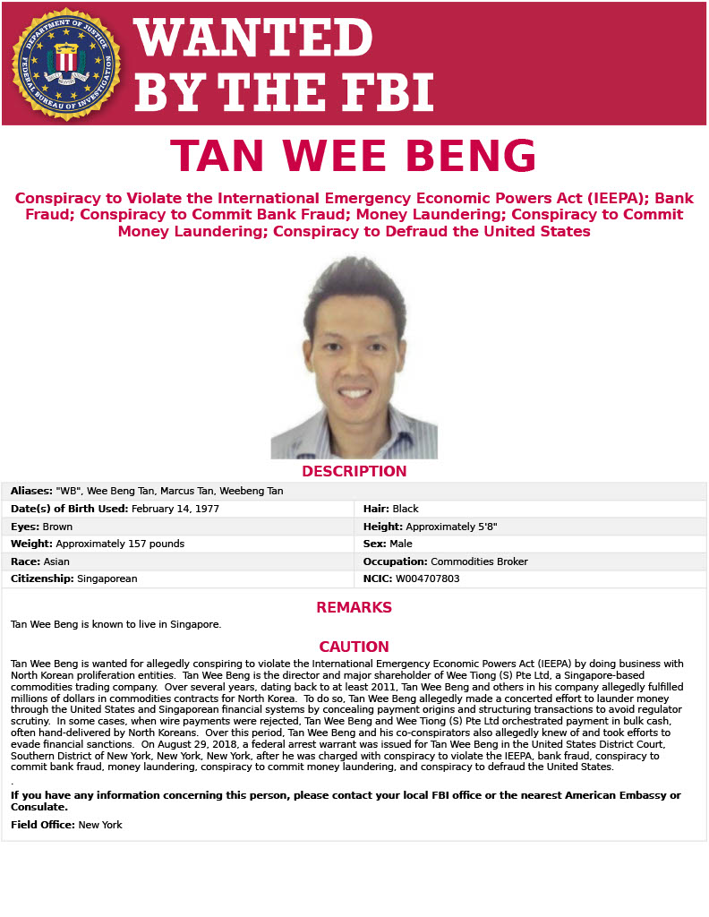 根据FBI当时发出的公告,陈伟铭是新加坡大宗商品贸易公司Wee Tiong的董事兼股东,他涉嫌隐藏付款来源和交易结构逃避新加坡和美国的金融监管,帮助朝鲜进行价值数百万美元的大宗商品交易;这些交易至少可以追溯到2011年。