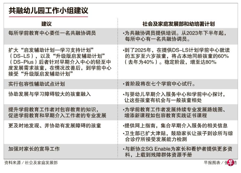 配合第三个残障服务总蓝图而成立的共融幼儿园工作小组,过去两年咨询900多人的意见后,提出七项建议与措施,当中包括包容性辅助试点计划(Inclusive Support Programme),旨在更好地支持有学习障碍的孩童融入主流学习环境。
