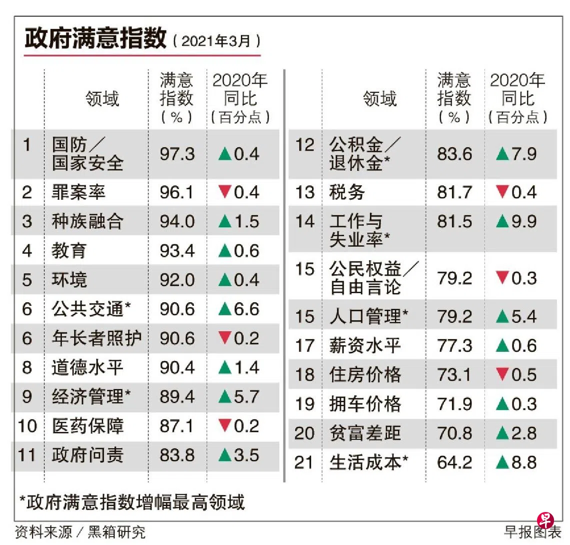 《联合早报》在对比黑箱研究每个月发布的政府满意指数(Government Satisfaction Index)后统计发现,相较于去年同时期的约20个不同指标中,公积金与退休金、公共交通和人口管理这三项指标今年3月在榜上的排名都有所上升。