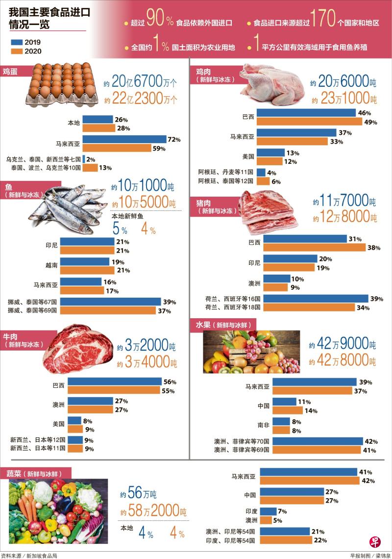 本地农场目前仅能满足约一成的国内食品需求,超过九成依赖从超过170个国家和地区进口。去年开始席卷全球的冠病疫情凸显新加坡在全球供应链中的脆弱,加上泰国暂停出口鸡蛋、乌克兰暴发禽流感而暂停进口家禽、天气恶劣导致金马仑高原蔬菜减产等意外事件,不断考验我国加强食品进口多元化的能力。