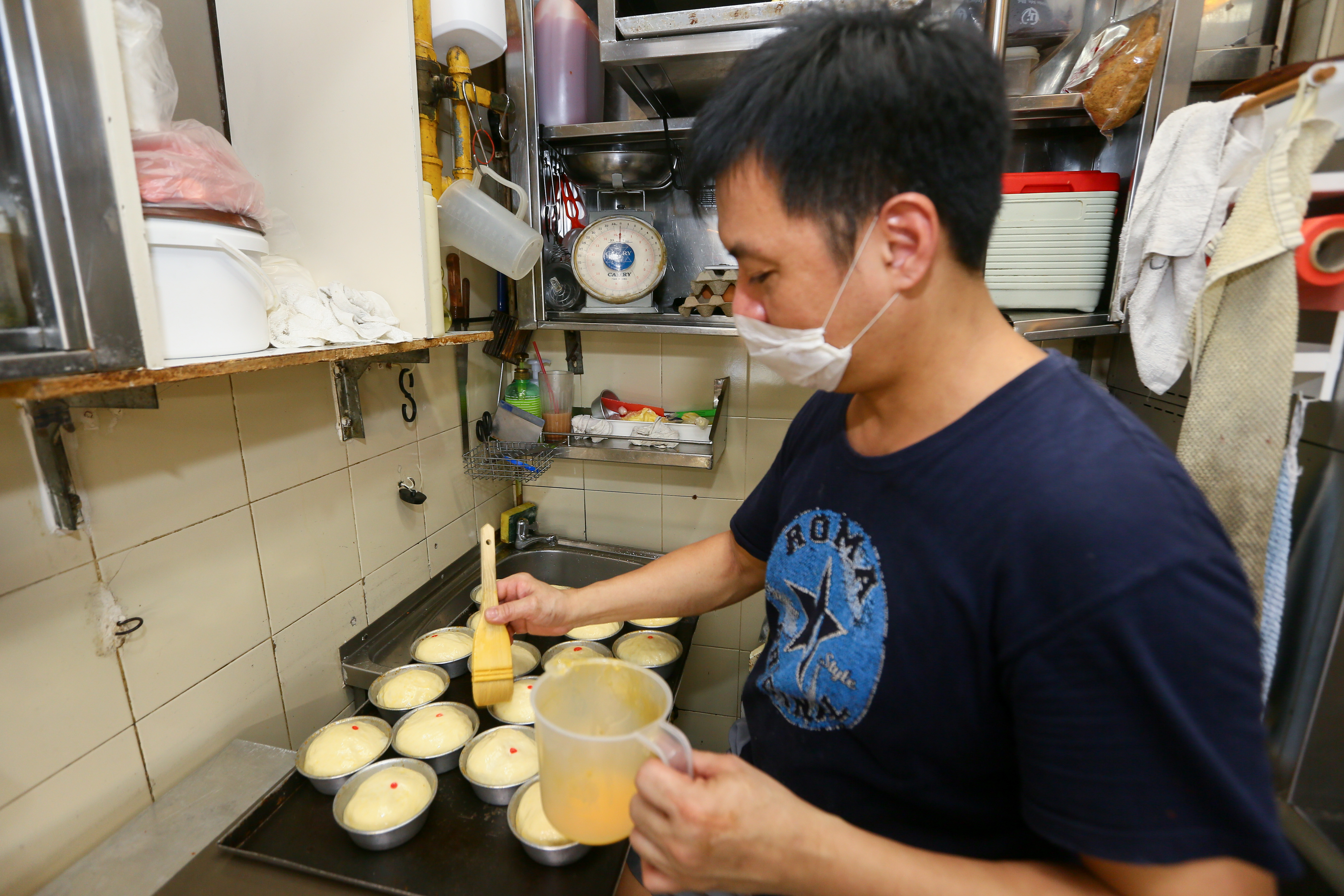 面包师傅谢家庆(45岁)读小学的时候,在学校假期期间与朋友到面包店打工,当时为的是赚取零用钱购买脚踏车的零件,之后便一心想学习制作面包。