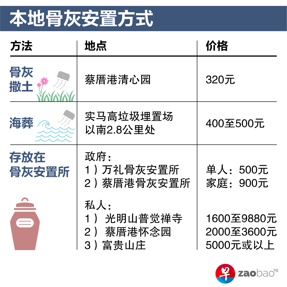 若选择火化遗体,之后还得决定骨灰的安置方式。本地目前的骨灰安置方式分为以上三种。