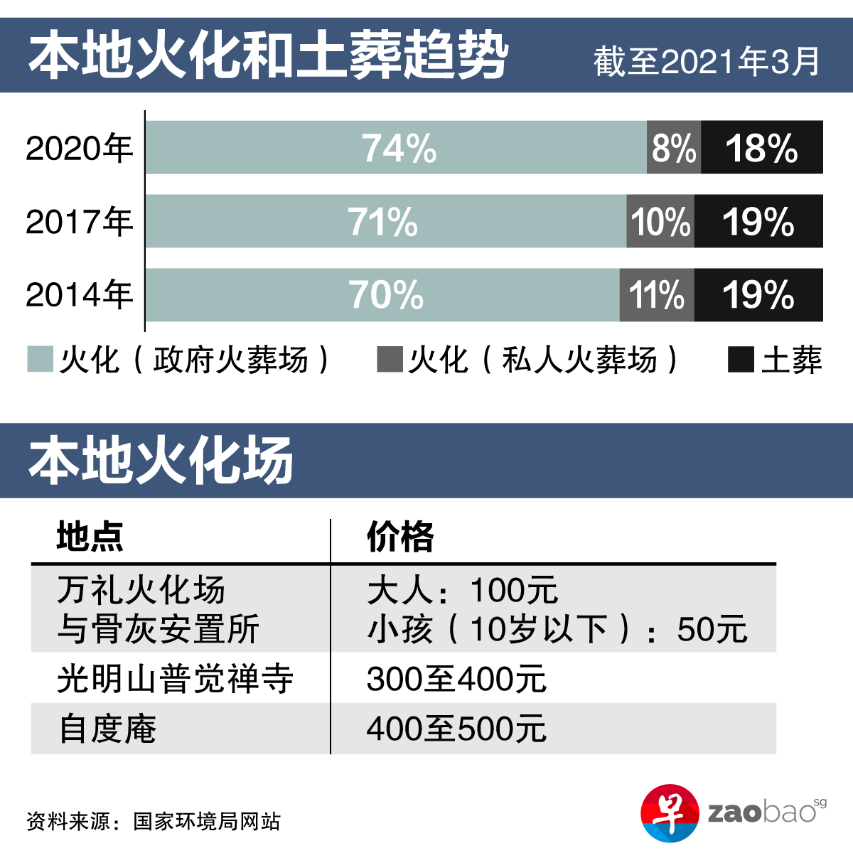 过去五年,本地每年平均有2万1000多人死亡。根据国家环境局数据,其中有高达82%的死者遗体由火化处理。新加坡土地越来越少,如今只剩下一家综合型的蔡厝港坟场供国人进行土葬,埋葬年限设为15年,遗体之后必须火化或重新埋葬。也因为如此,除非出于宗教原因,多数人不会选择土葬。