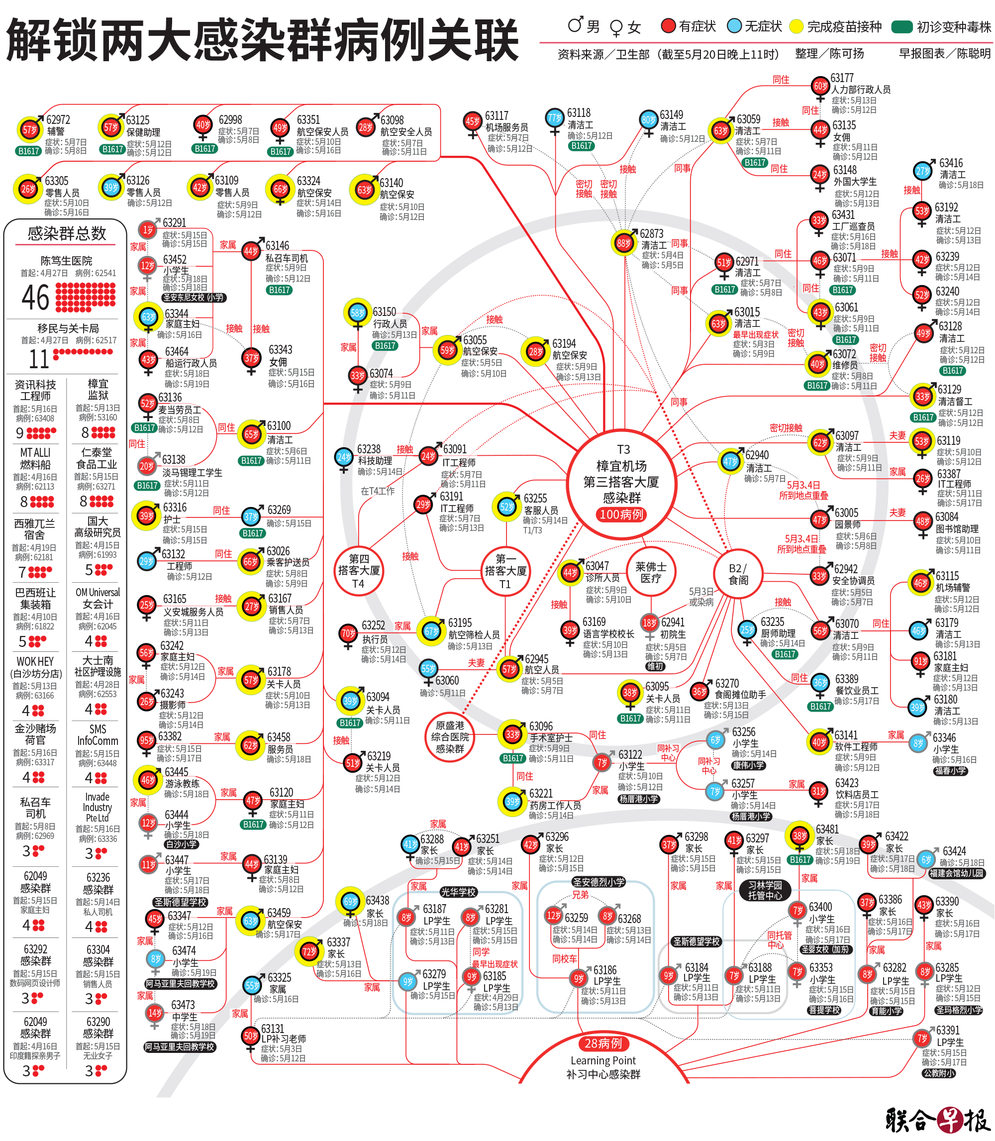 解锁两大感染群 病例关联截至5月20日晚间11时,冠病在本地的第二波社区感染已经形成24个活跃感染群,涉及281名病患。其中最大的是已有100起确诊病例的樟宜机场第三搭客大厦感染群。另外,有多名小学生确诊的Learning Point补习中心感染群也累计达到28起病例,备受各界关注。点击显示大图。资料来源/卫生部(截至5月20日晚上11时)早报图表/陈聪明目前许多社区感染群都未找到源头,它们之间是否有着隐形的关联?5月18日,原本独立的盛港综合医院感染群由于发现与樟宜机场感染群存在关联而被并入后者,其他小型感染群会不会出现类似的情况?一切有待流行病学调查的结果。购买此文章