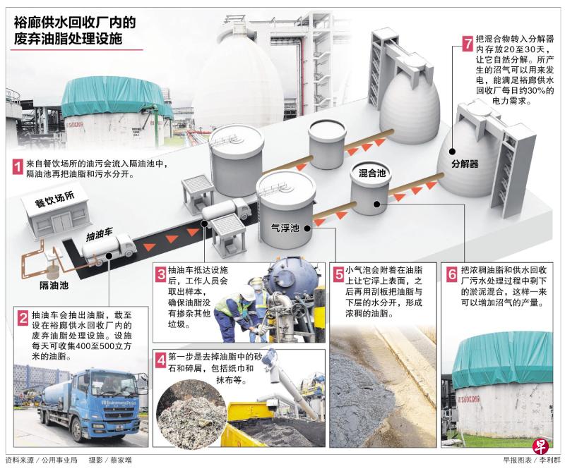 本地现有的唯一一座废弃油脂处理设施坐落于裕廊供水回收厂,它于2008年启用,每个月可以分解1万1000立方米的油脂,相当于6万9000个汽油桶的容量。