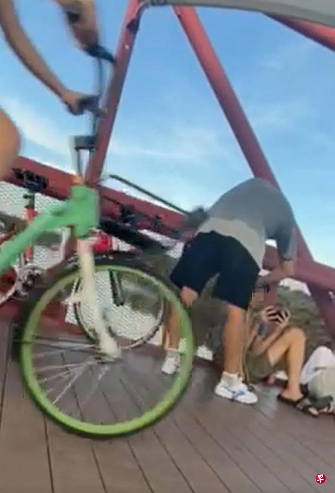 视频一开始,男子质问玩手机的男生说,桥上这么多人骑车,他为什么把脚伸出来。男生过后出声要男子停止责骂,但对方却猛推他的头说:“你不要这么没礼貌”。