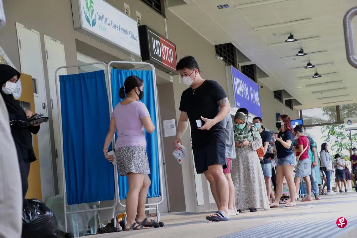 卫生部为曾到访盛港西道第455座邻里商店的公众提供免费冠病检测,同座组屋的两家诊所外大排长龙,最多的时候有约20人排队。